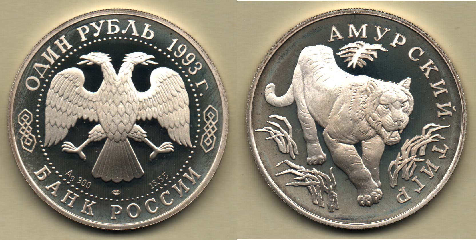 Rubl 1993 - tygr amurský, Y.335 (Ag900, 15.55g), patina, kapsle