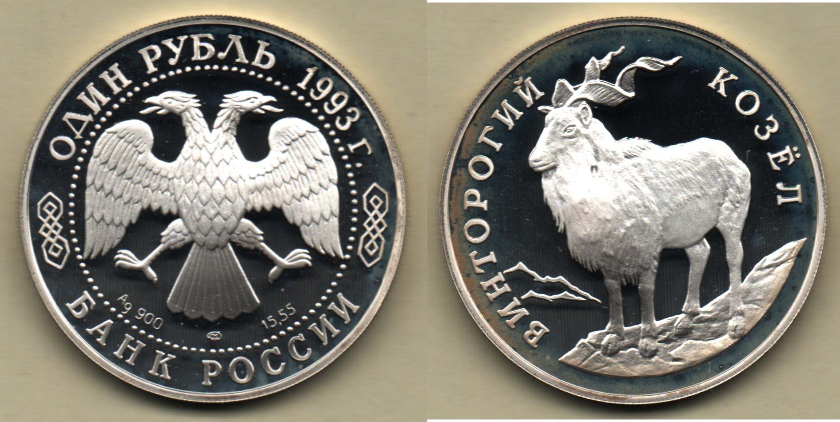Rubl 1993 - kozel šrouborohý, Y.337 (Ag900, 15.55g), patina, kapsle