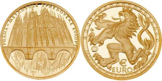 Oppl - 100 Euro 1999 - zavedení nové měny - chrám sv.Víta, Karlův most, opis / znak ČR, opis, Sign., Au999, 23mm, 7.827g, kapsle, etue, karta