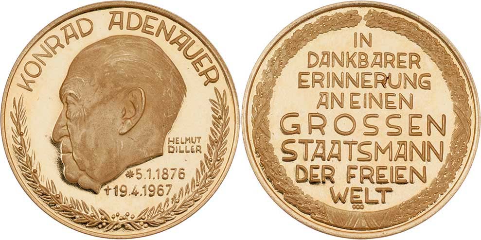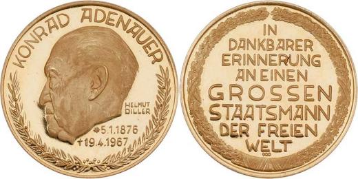 Konrád Adenauer - úmrtní medaile 1876/1967 - hlava zleva, věnec, opis a nápis/ 8-řádkový nápis ve věnci, Au900, 22mm, 7.008g, kapsle