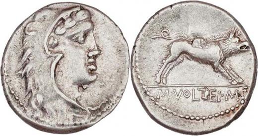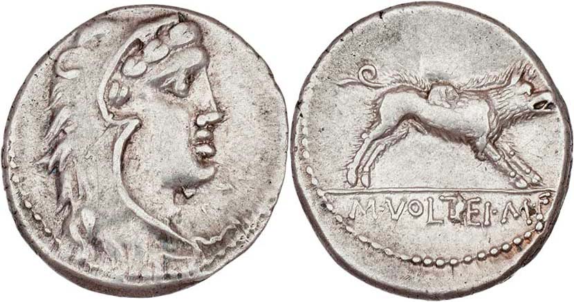 AR Denár, Hlava Herakla zprava / Erymanthijský kanec zprava, nápis "M.VOLTEI.M.F.", Seaby.Volteia.2, Crawford.385/2, Alb.1281, nep.exc., pěkná patina