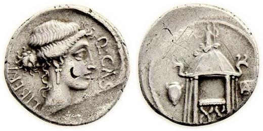 AR Denár, Hlava Liberty "LIBERT.Q.CASSIVS."/ kurulské křeslo v chrámu Vesty, nápis "A.C.", Crawford.428/2, Seaby.Cassia.8, Alb.1354, kontramarka, nedor., patina