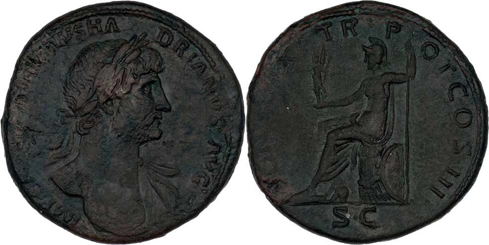 AE Sestercius, Rv:"PONT.MAX.TR.POT.COS.III.S.C." sedící Roma, podobný jako S.1019, RIC.562b - mincovna Řím - ražba z let 119 - 121, nep.kor., patina