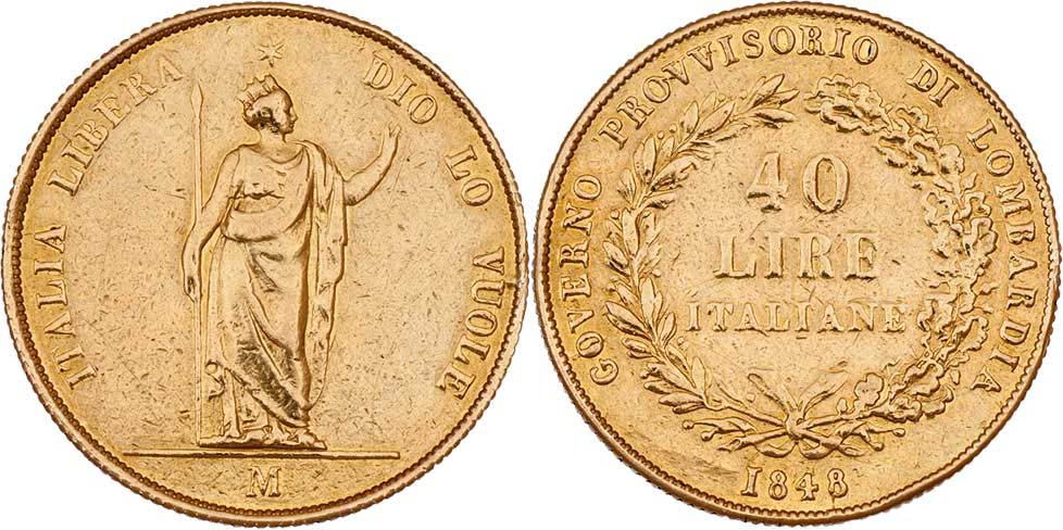 40 Lira 1848M - stojící Italie, italský opis/ 3-řádk. nápis ve věnci a opis, Cr.24 (raženo pouze 5875 ks), 12.670g, stopy po zasazení, dr.hr., dr.rysky R!