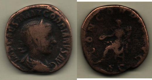 AE Sestercius, Rv:"CONCORDIA.AVG.S.C.", sedící Concordia, S.neuvádí, RIC.268 - mincovna Řím - ražba z roku 240, poškrábaný, patina