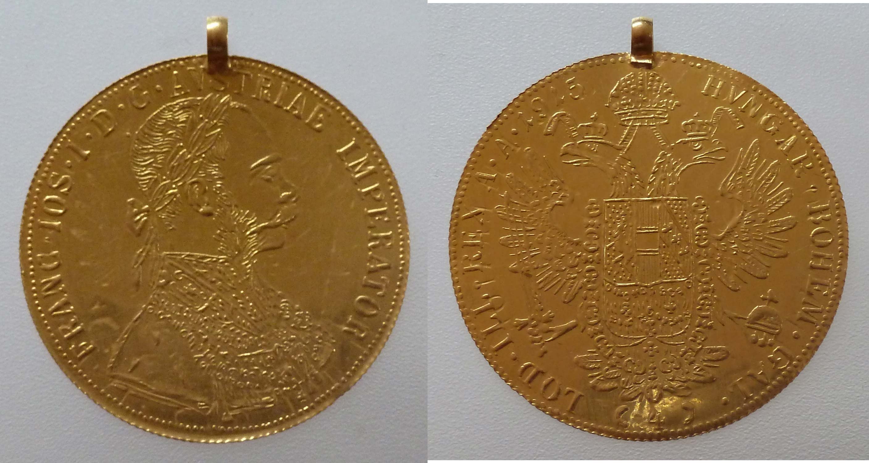 4 Dukát 1915 - orientální napodobenina s ouškem (patrně přívěšek na lidový kroj), hmotnost pouze 4.232g, ryzost 750/1000, dr.hr., rysky