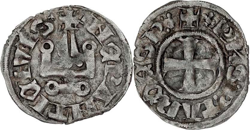 AR Denier (Tournois), minc.Lepanto, styliz.hrad, opis / velký kříž, opis, De Wit.III.3982, MPS.str.397/111 - 112, 0.877g, nep.nedor., pěkná patina R!