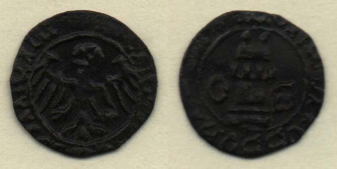 Haléř (cca 1445), Kop.8682, Fried.488, Sa.neuv., 0.268g, mírně exc., nep.nedor., pěkná tmavá patina R!