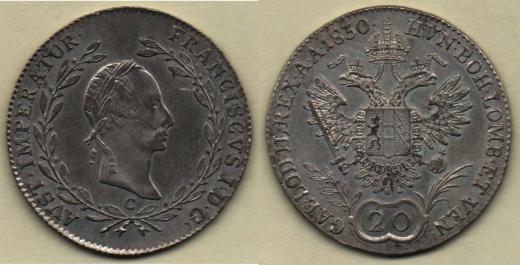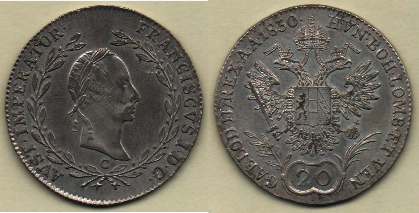 20 Krejcar 1830 C, 6.680g, nep.hr., vl.rysky, pěkná patina, téměř
