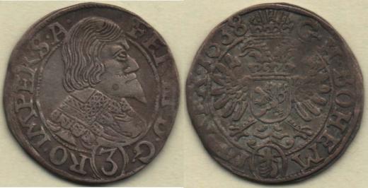 3 Krejcar 1638, Praha-Wolker, J.3a, MKČ.1180, 1.912g, nep.nedor., pěkná patina