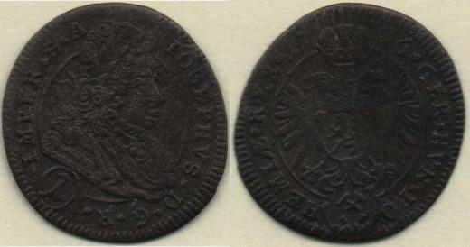 Krejcar 1706, K.Hora-Wohnsiedler, J.2a, MKČ.1732, (značka bez kopců, poprsí nedělí opis), 0.760g, nedor., nep.kor., tmavá patina R!