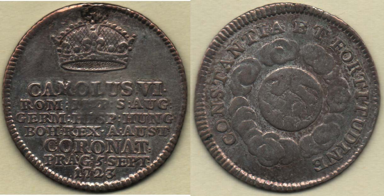 AR větší jeton na korunovaci v Praze 5.9.1723 - Země v oblacích, opis / koruna a 7-řádkový nápis, Nesign., 25mm, 4.465g, ČS.1110, M.1579, Nov.Z.6b, m.o., patina