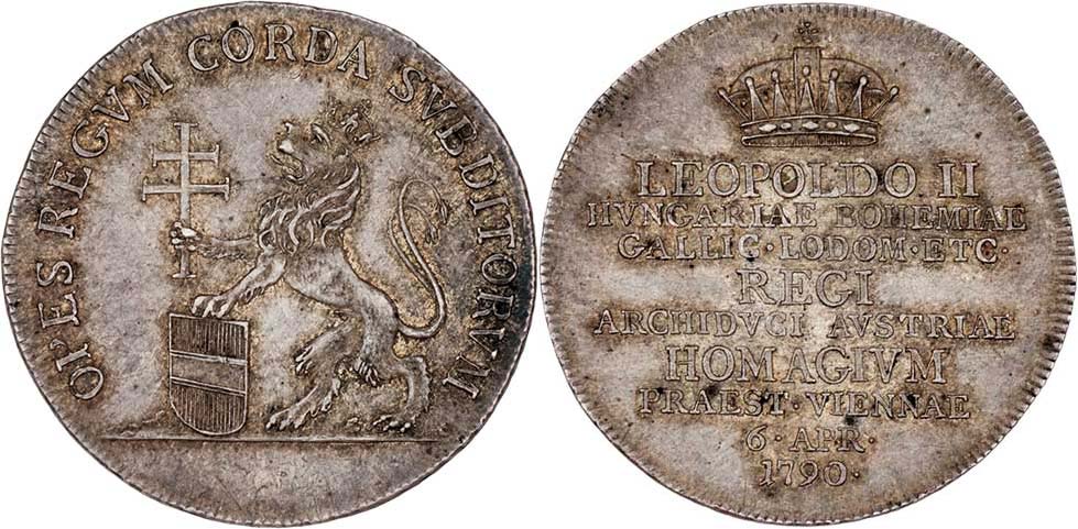 Větší jeton na holdování ve Vídni 6.4.1790 - stojící lev se znakem a křížem, opis / koruna a 9-řádk.nápis, Ag 25mm, 4.386g, M.2190, H.3239, Nov.B.2b, pat., tém.