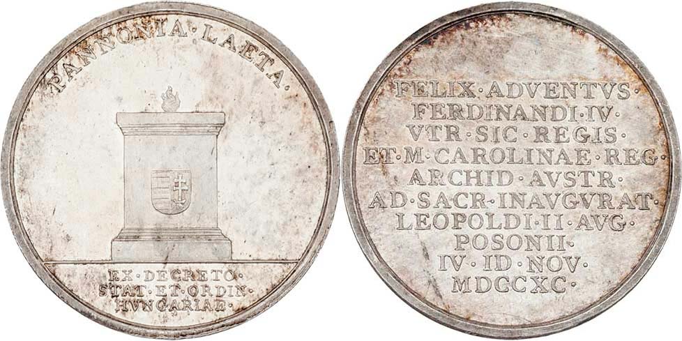 Jeton k příjezdu na uherskou korunovaci 4.11.1790 - ohňový oltář, opis a nápis / 10-řádk. nápis, Nesign., Ag 25mm, 4.332g, M.2222, H.3252, nep.rysky, patina
