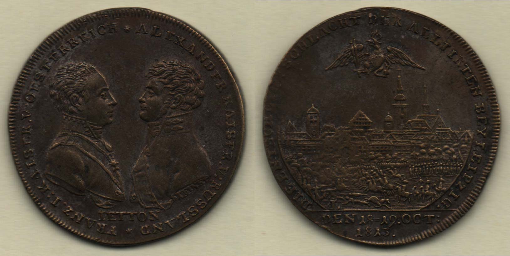 Jeton na vítězství v bitvě u Lipska 18.-19.X.1813 - poprsí dvou císařů proti sobě, opis / bitevní scéna, město, opis, Sign.Steiner, mosaz 33mm, M.2382, patina