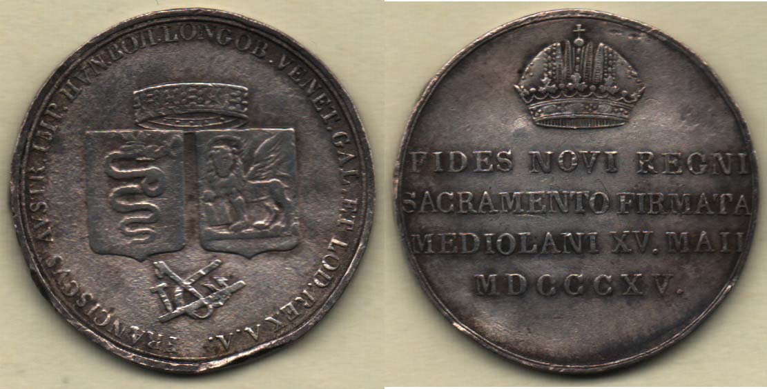 AR jeton na holdování stavů v Miláně 15.5.1815 - kor. znaky Milána a Benátek, opis / koruna, nápis, 22mm, 3.912g, Nov.R.3b, M.2416, velké hrany, rys., patina