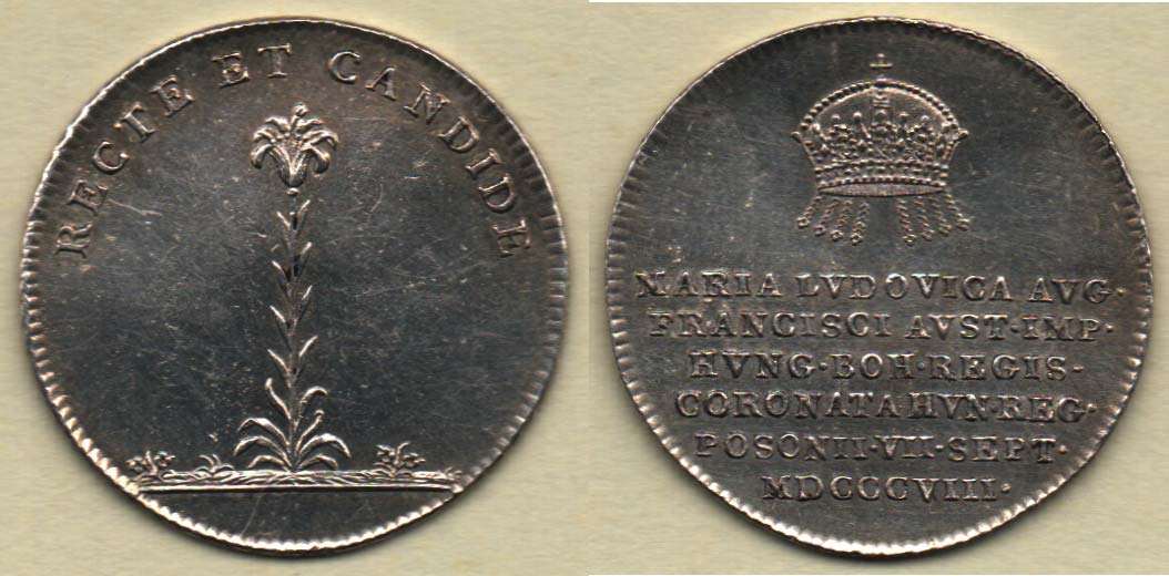 AR menší peníz na korunovaci v Bratislavě 7.9.1808 - lilie, opis / koruna a 6-řádkový nápis, Nesign., 21mm, 2.208g, Nov.U.3b, M.2361, H.3402, patina