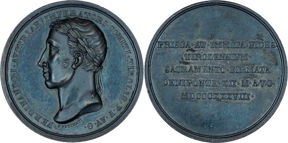 Putinati - AE medaile na holdování v Tyrolsku 1838 - hlava zleva, opis / 5-řádkový nápis, Sign., 34mm, 22.393g, Nov.F.1c, M.2576, P.5/3, patina