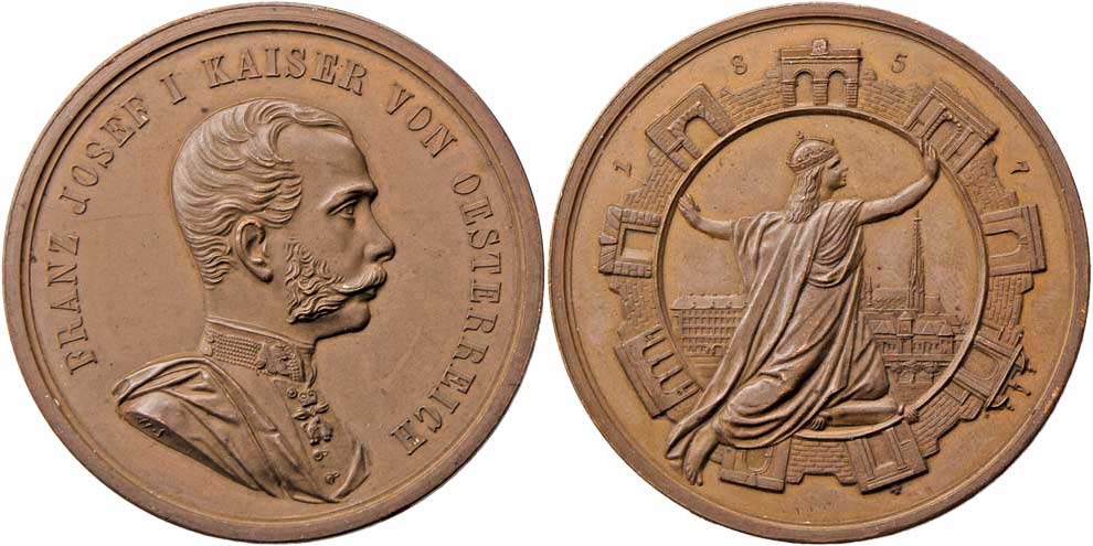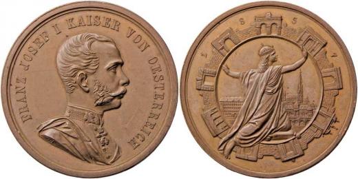 Seidan - AE medaile na otevření Ringstrasse 1857/1865 - poprsí zprava, něm.opis / Vindobona bořící hradby, nápis na hraně, Sign., 44mm, 32.554g, Haus.2235, pat.