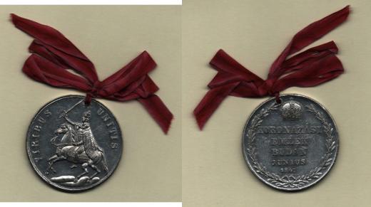 Cín.medailka na korunovaci v Budíně 8.6.1867 - císař na koni, latinský opis / koruna a maďarský nápis ve věnci, 32mm s pův.raž.ouškem a dob.stužkou, Nov.22a
