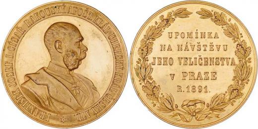 Christlbauer - čes.medaile na návštěvu Prahy 1891 - poprsí zprava, český opis / 5-řádkový český nápis ve vavřínovém věnci, Sign., zlacený bronz 54 mm, patina