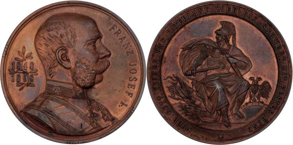 Pittner - na padesát let vítězných bojů 1848 / 1898 - poprsí zprava, vročení, opis / sedící Mars, orel na štítu, trofeje, opis, Sign., měď 50 mm, patina