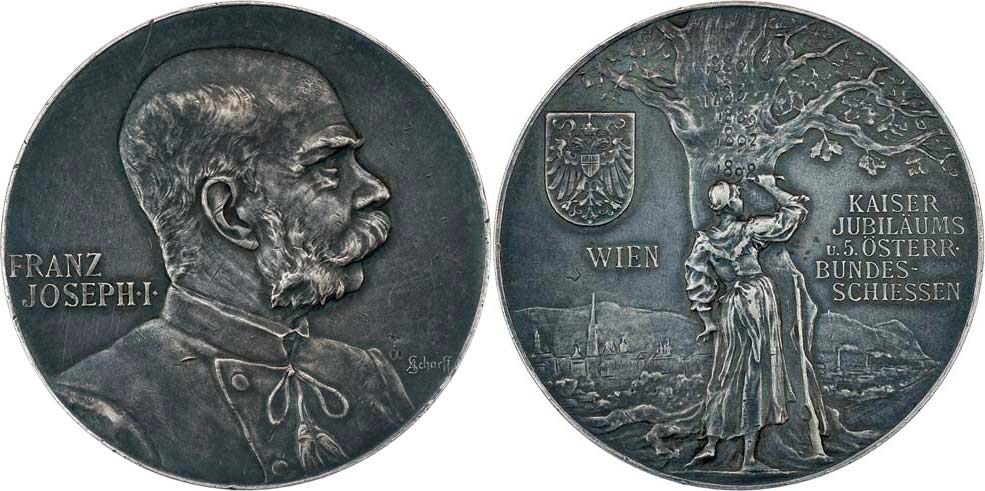 Scharff - jubilejní V.spolk.střelby ve Vídni 1898 - poprsí zprava, nápis / žena vyrývá vročení do stromu, znak, nápis, Sign., Ag 37mm, 24.955g, dr.hr., dr.škr.