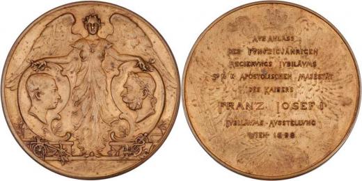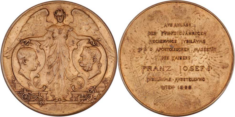 Waschmann - jubilejní výstava na 50 let vlády 1898 - mladý a starý portrét ve štítech, nad nimi Niké/ znak překrytý nápisem, bronz 62mm, 79.178g, patina, téměř