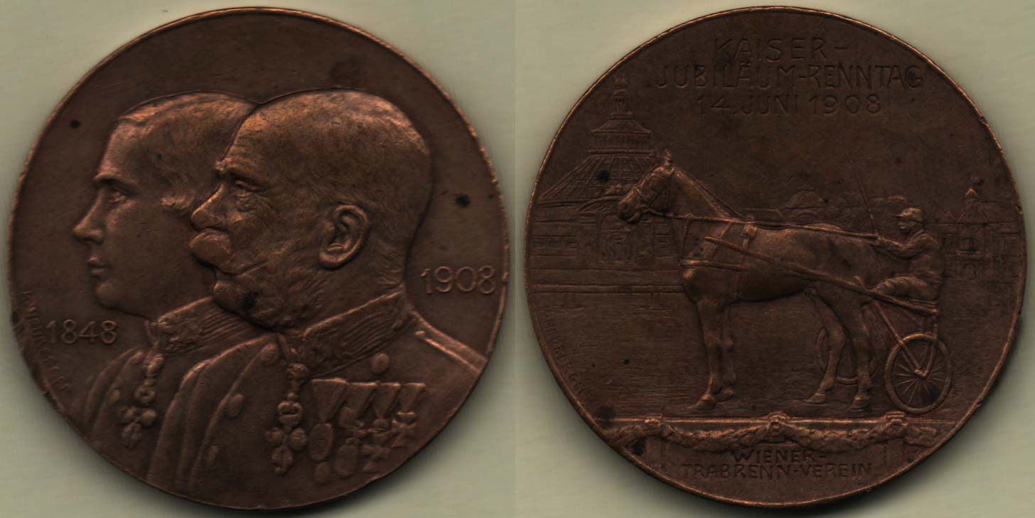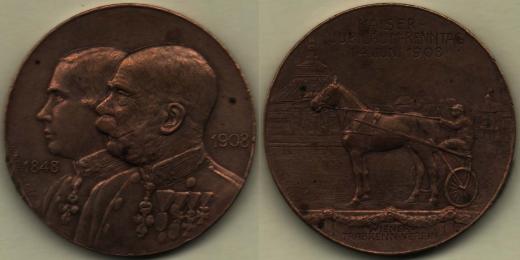 Neuberger - jubilejní závody klusáků v Prátru 1908 - mladé a staré poprsí zleva, vročení / kůň s vozíkem, budovy a nápisy, Sign., bronz 30mm, hr., skvr., pat.