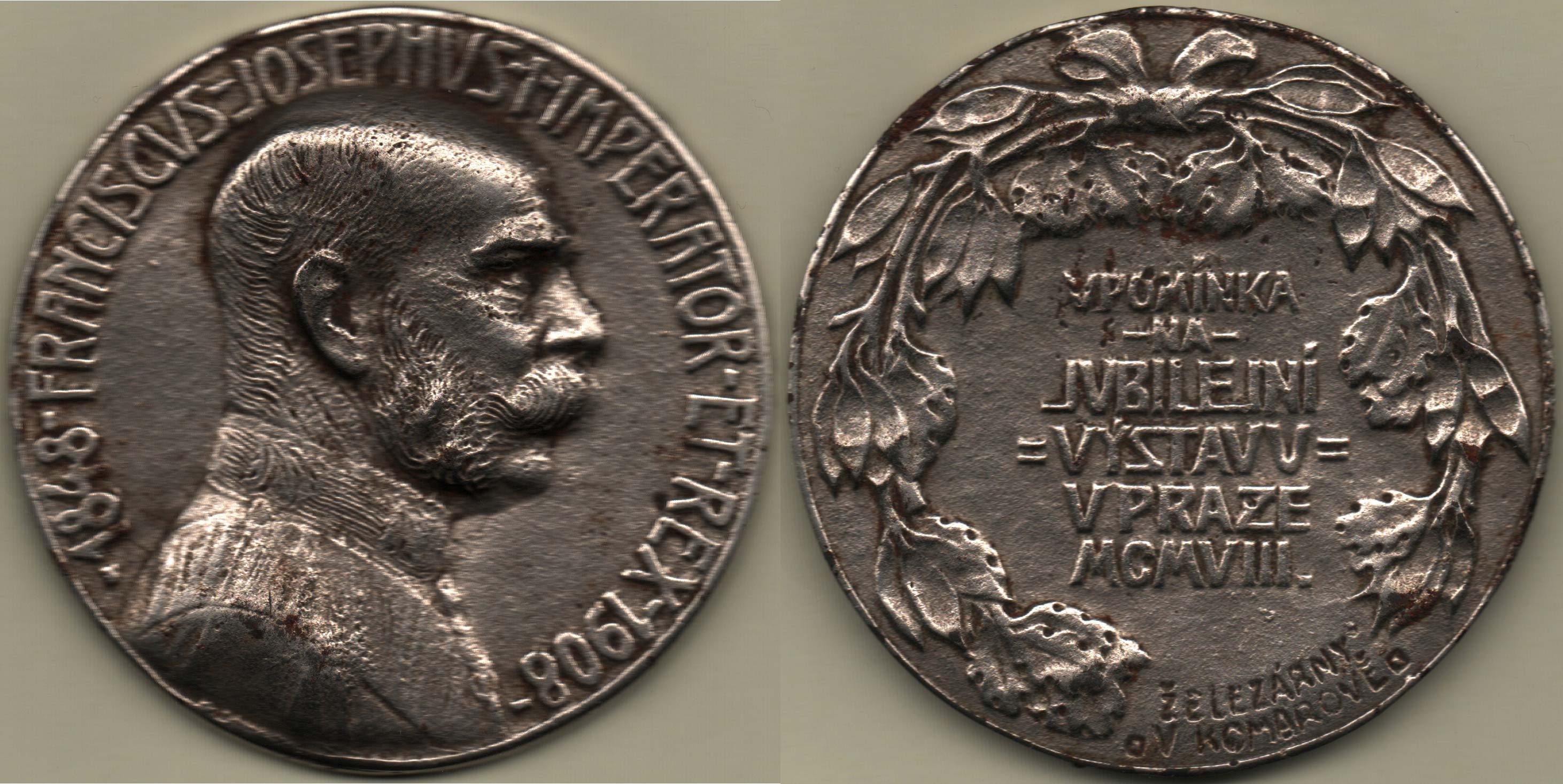 Železárny Komárov - upomínka na jubil. výstavu 1908 - poprsí zprava, opis / nápis ve věnci z vavřínu a dubu, patinované lité železo 60 mm