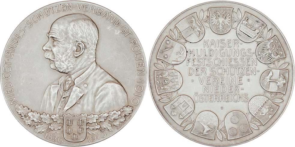 Neuberger -jubil.dolnorak.střelby v St.Pölten 1910 - poprsí zleva, znak, ratolesti a opis / 7-řádk. nápis, znaky měst v kruhu, Sign., Ag 45mm, 39.767g, nep.rys.