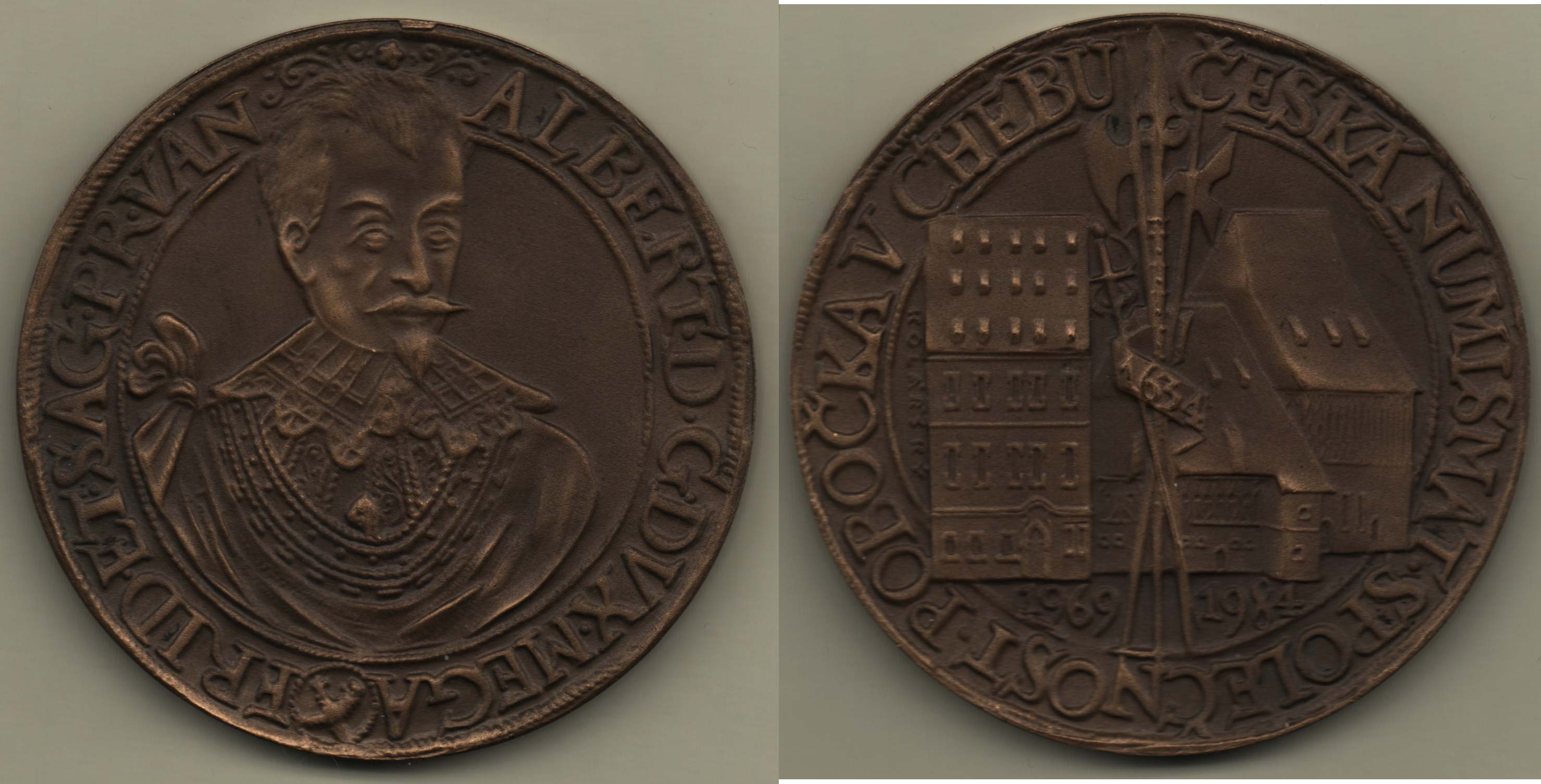 Kolářský - ČNS Cheb - 15 let pobočky 1984 - replika aversu desetidukátu Albrechta z Valdštejna / budovy, zbraně a opis, Sign., pat.bronz 60 mm, BK.11 (300ks)