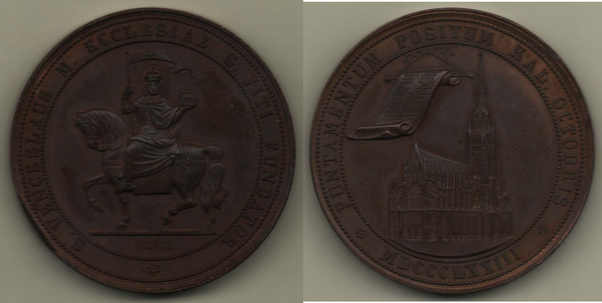 Chrám sv.Víta, plán dostavby, opis / svatý Václav jede na koni doleva, opis, Sign.V.Kříž, měď 40 mm, 44.980g, Přib.655b, velká hrana, krásná patina