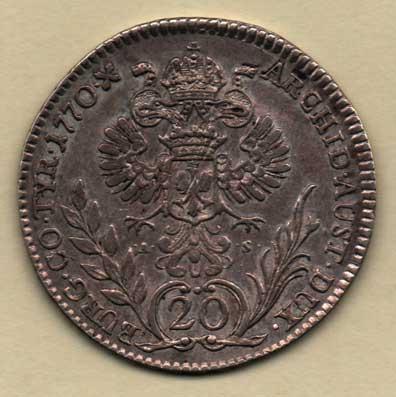 20 Krejcar 1770 A-S, Hall, N.55, 6.621g, nep.just., dr.rysky, pěkná patina