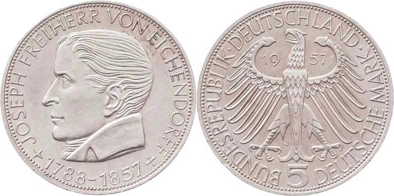 5 Marka 1957 J - Eichendorff, KM.117, 11.187g, nep.hr., nep.rysky, téměř RR!