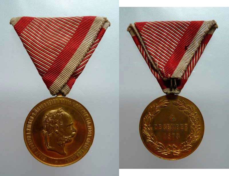 Válečná pamětní medaile 2.DEC.1873, Marko.364b, VM1.28a, Sign.TS, zlacený bronz, původní stuha
