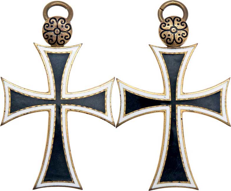 Náhrdelní profesní kříž řádového rytíře, Nesign., zlacený smaltovaný bronz 42x60 mm s malým kroužkem, chybí závěsný prstenec a stuha