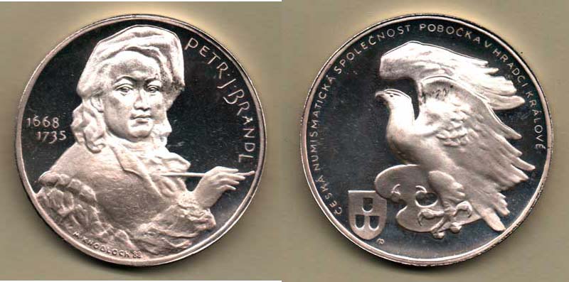 Knobloch - Petr Brandl (1668-1735) 1988 - poprsí mírně zprava, vročení, opis / holubice na paletě, znak, opis, Sign., postříbřený bronz 42 mm, FM.12