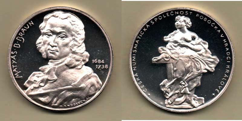 Knobloch - Matyáš Bernard Braun (1684-1738) 1988 - poprsí mírně zleva, vročení, opis / socha Naděje, opis, Sign., postříbřený bronz 42 mm, FM.13