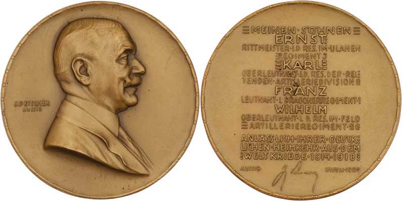 Ignaz Petschek - na návrat všech 4 synů ze svět.války 1920 - poprsí zprava, nápis / 16-řádkový nápis a faksimile podpisu, Sign., patinovaný bronz 60 mm