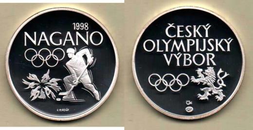 Český olympijský výbor - ZOH Nagano 1998 - český lev s olympijskými kruhy, nápis / emblém, hokejista, nápis, Sign., Ag900, 31mm, 13.114g, kapsle, etue
