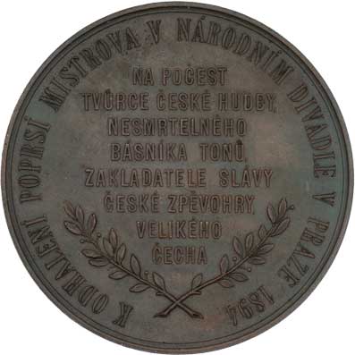 B.Smetana - odhalení poprsí v Národním divadle 1894 - poprsí zleva, opis / vavřínové snítky, nápis a opis, Sign., bronz 50 mm, krásná patina