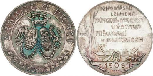 Šmakal - Hospodářská, lesnická a prům. výstava 1909 - dva znaky pod korunou, lipové ratolesti, opis / nápis a výst.atributy, Sign., Ag 35mm, 15.903g, původ.etue