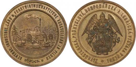 Živnostenská, průmysl., hospodář. a lesnická výstava b.l. - městský znak nesený andělem, opis/ výstavní atributy, opis, Sign.EF, zlacená měď 40 mm, téměř