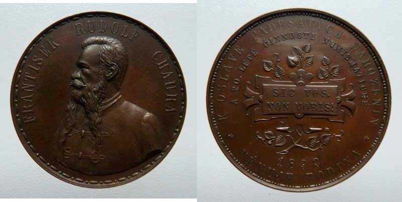 Frant. Rudolf Chaura - medaile na 50.narozeniny 1892 - poprsí zleva, opis / tabulka s latinským heslem, lip.ratolest, opisy, Sign.Golčmid, měď 34 mm, patina