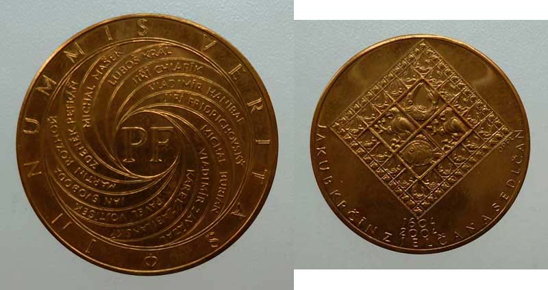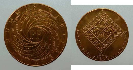 PF 2004 - renesanční kachel se znakem Jakuba Krčína, opis / v paprscích jména vydavetelů, velké "PF" a opis, Sign., mosaz 30mm, patina, etue R!