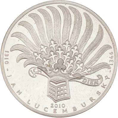 PF 2010 - Jan Lucemburský - přilba s králov. korunou, chocholem a stuhou, opis/ v paprscích jména vydavat., velké "PF" a opis, Sign., Ag925, 30mm, 14.687g R!