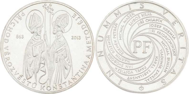 PF 2013 - stojící svatí Konstantin a Metoděj, vročení a opis / v paprscích jména vydavatelů, velké "PF" a opis, Sign., Ag925, 30mm, 14.637g R!