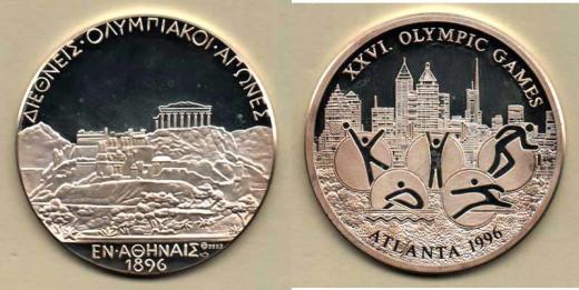 Nesign. (Zlatá Koruna) - LOH 1896 Atény / LOH Atlanta 1996, Ag999, 35mm, 14.882g, patina, kapsle