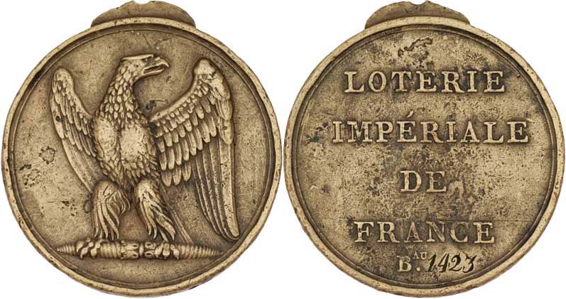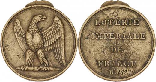 Medaile (los) Franc. imperiální loterie b.l. (č.1423) - orel sedící na blesku / 4-řádkový nápis, Nesign., litá mosaz 54 mm s ulomeným závěsem, patina RR!